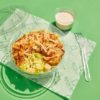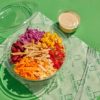 Feta cheese topped on fresh lettuce, tomato, mixed pepper, and cucumber with Italian dressing